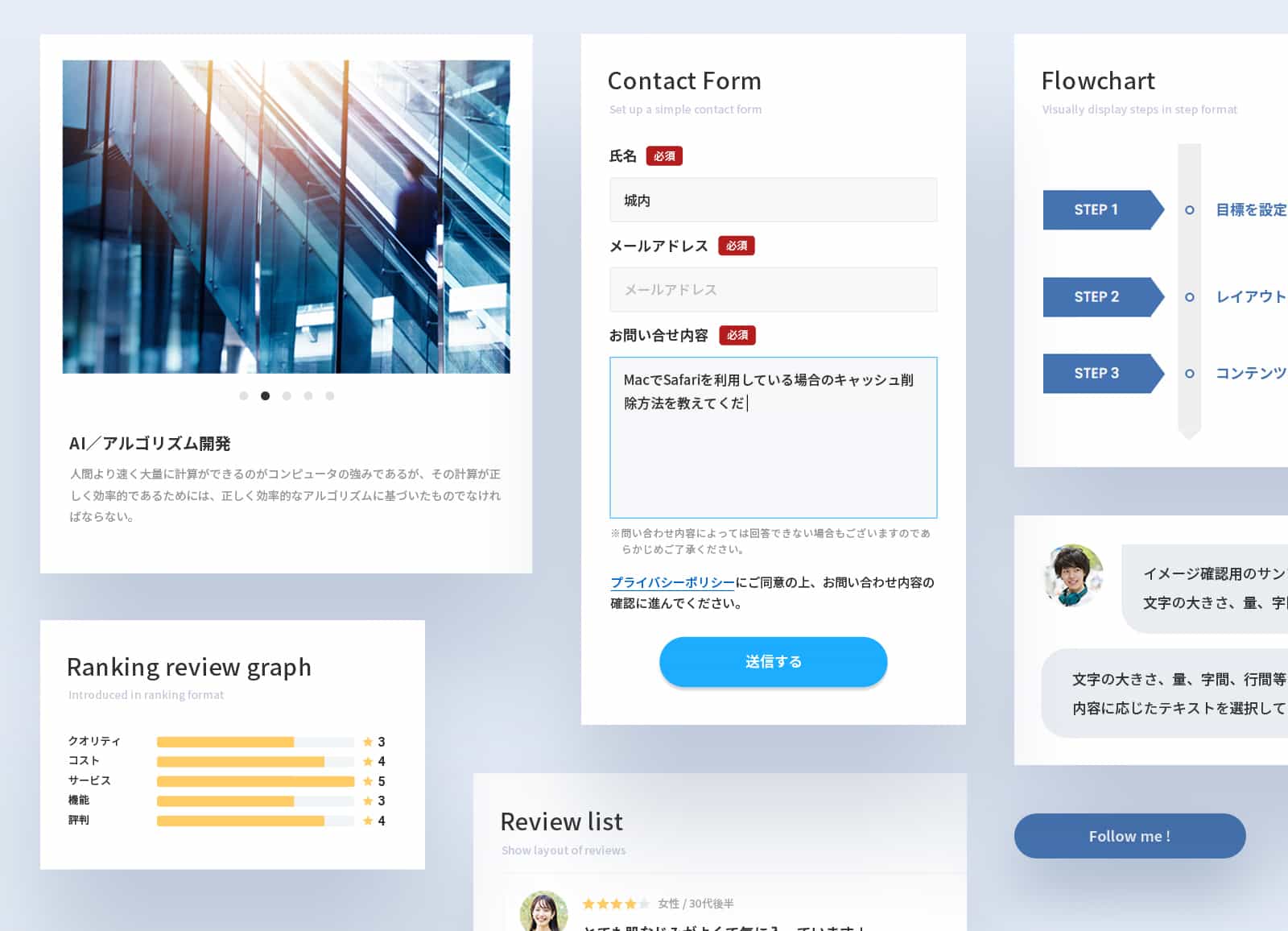 | 必要デフォルトではCSSのカスタマイズが必要 | 不要プロがデザインした豊富なパーツ ![]() |